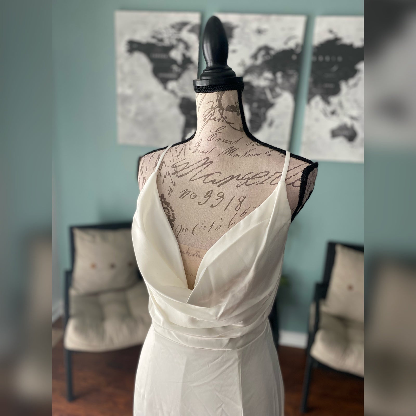 NWT Minimalist sheath wedding dress with elegant draped cowl neckline and tie up bow back. Small train. Tag size 6 from Cinderella/ladivine brand.
